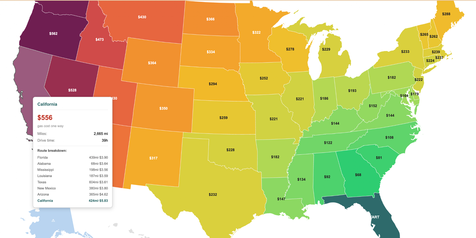 Hover over any state to see the total miles, drive time, gas cost, and a full route breakdown showing every state you pass through and what gas costs there.